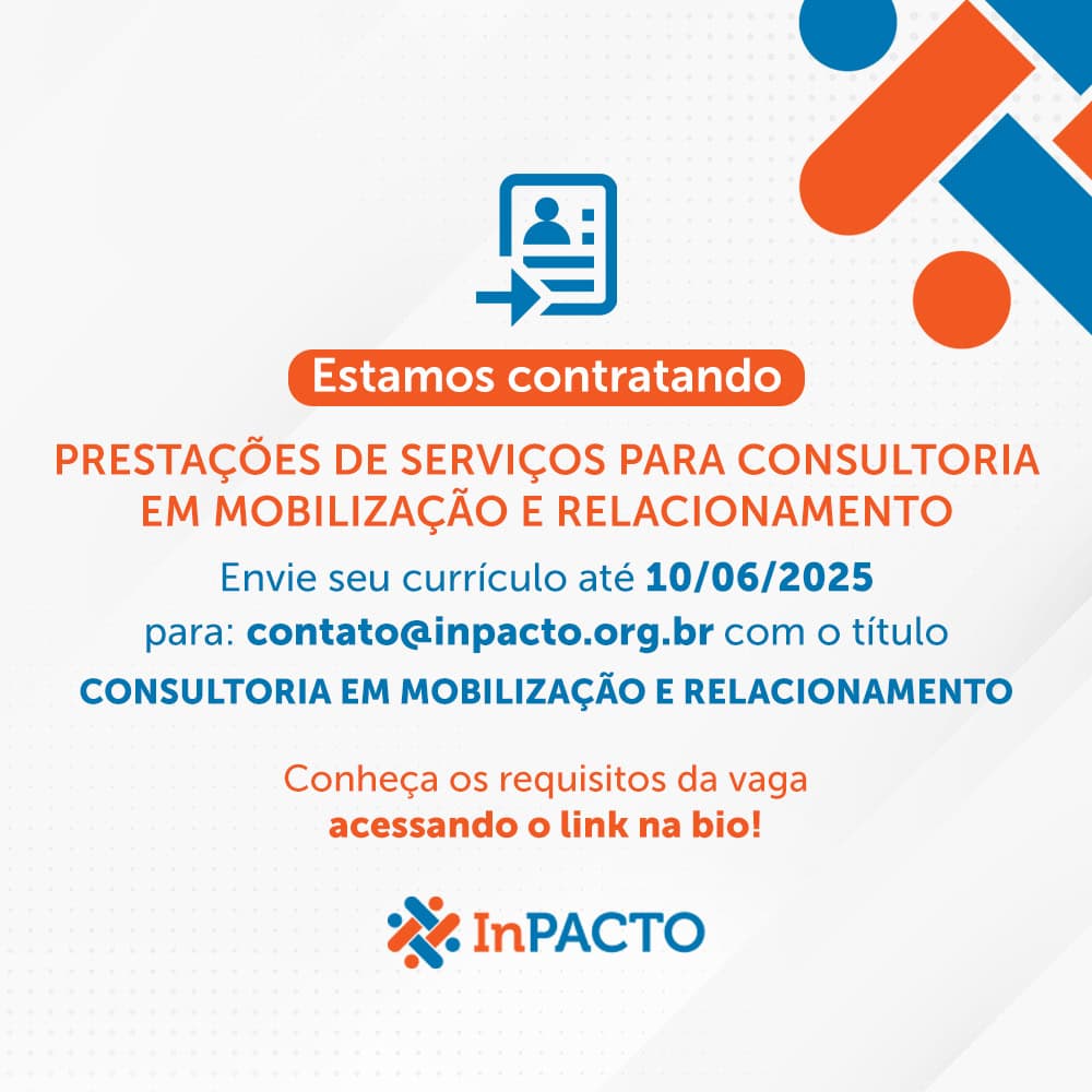 Com o compromisso de fortalecer sua atuação institucional e ampliar sua rede de parcerias, o InPACTO lança uma oportunidade para consultoria que irá apoiar a criação e o aprimoramento de processos estratégicos de relacionamento com associadas, articulação com o setor produtivo, poder público e desenvolvimento de novas frentes de captação. Entre os objetivos estão: Diagnosticar […]